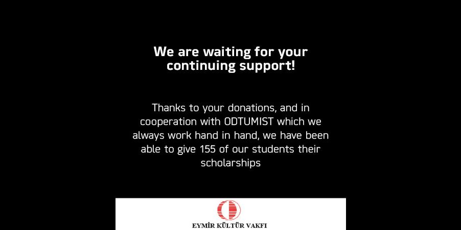 Thanks to your donations, and in cooperation with ODTUMIST which we always work hand in hand, we have been able to give 155 of our students their scholarships. Our deliveries will continue until the end of the academic year, and in general until the students graduate. We are increasing the number of scholarship students as we contact them and as we verify sound contact information. Our target is 400 students. We want to increase this number in accordance with the continuation of your donations. We wish to remind you that all the numbers communicated to you will be those that we have been able to reach hand in hand with ODTÜMİST.
