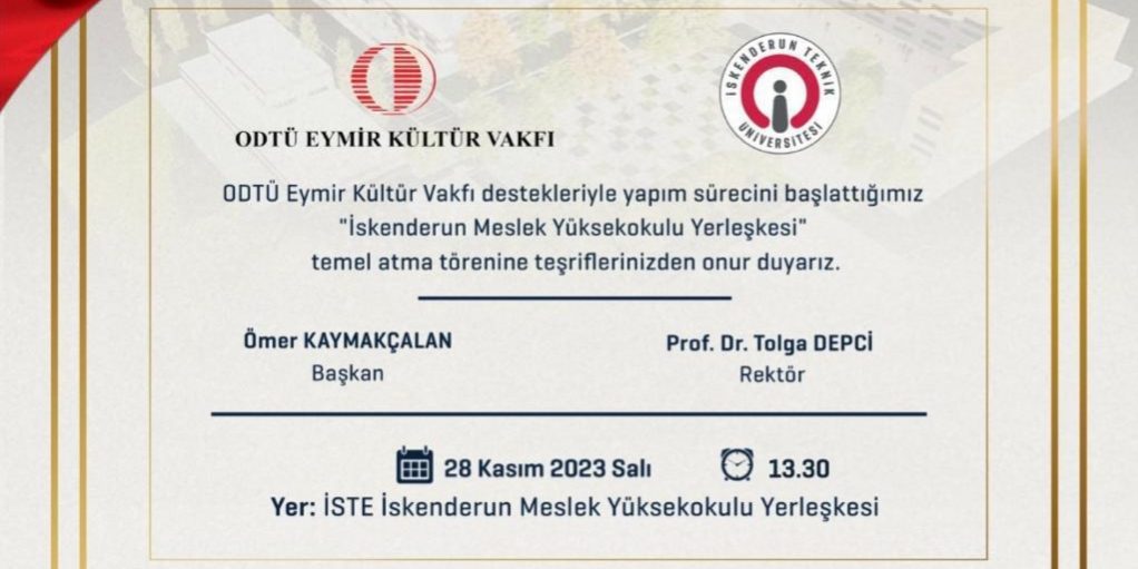 Değerli katkılarınızla gerçekleştirmek üzere yola çıktığımız İskenderun Teknik Üniversitesi İskenderun Meslek Yüksekokulu ve Atölye binalarının temel atma töreninde sizleri de aramızda görmek isteriz.